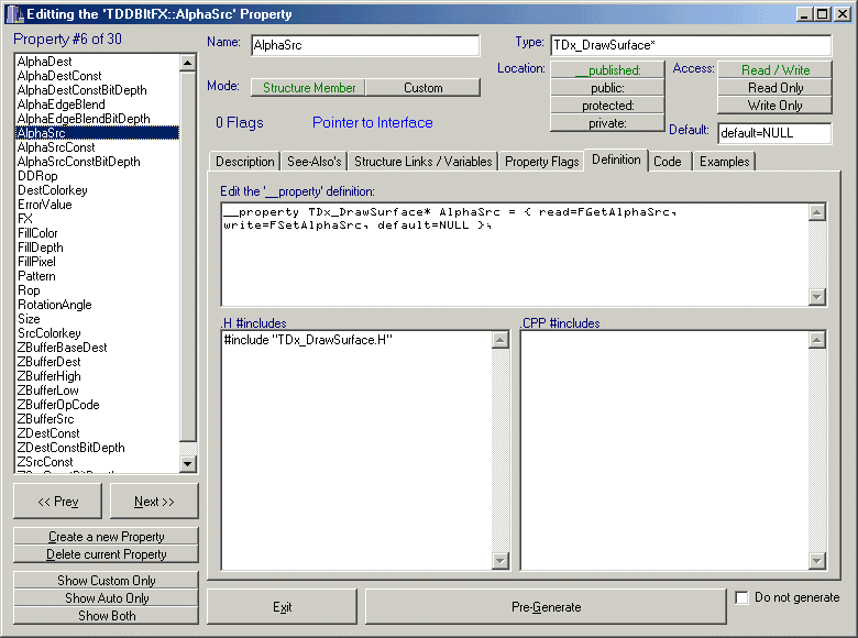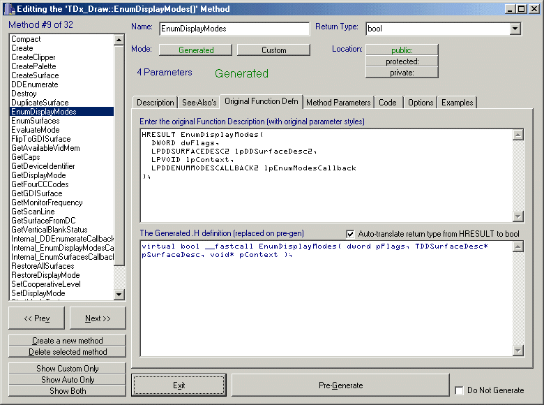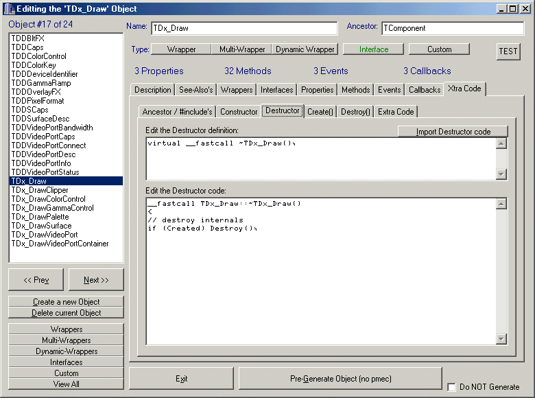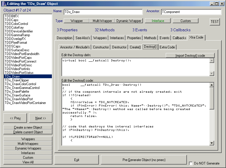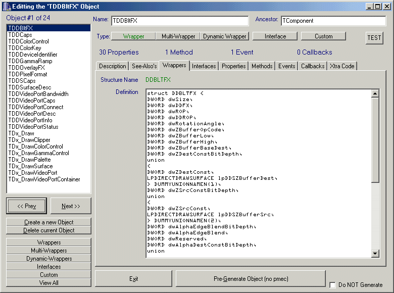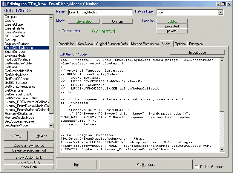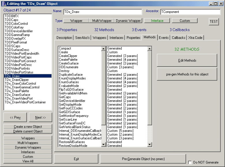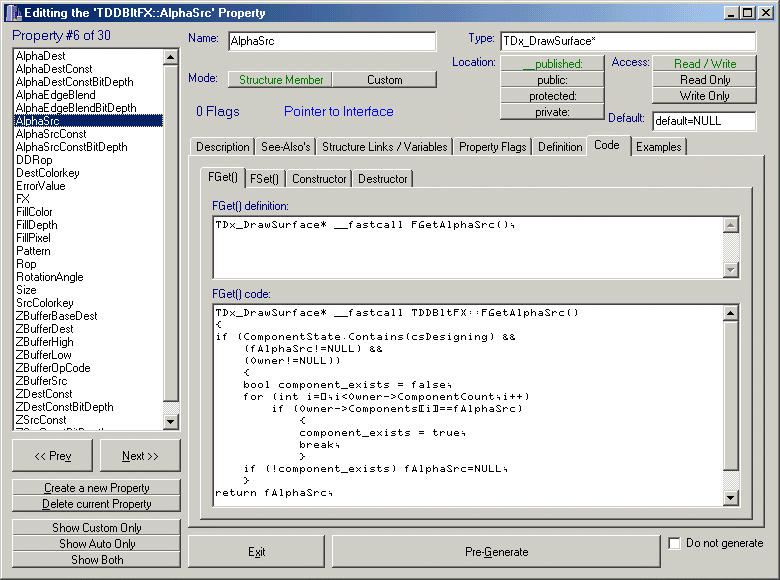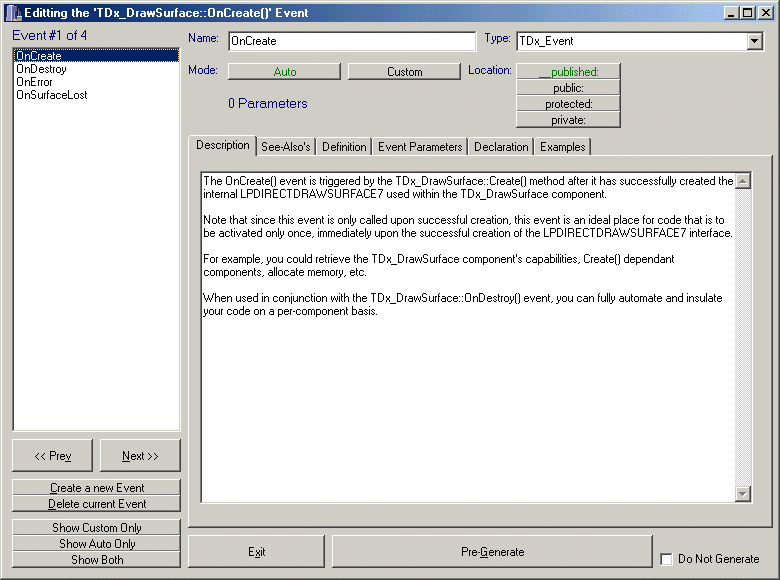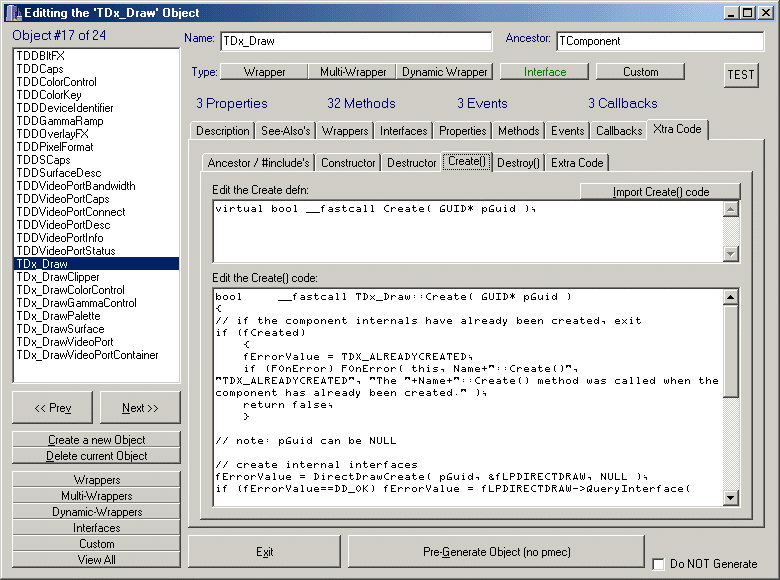 - Pre-Generation (pregen) is where the generator auto-creates database records, code, descriptions, settings, etc. as required to convert from Win32 style code to working VCL style code.